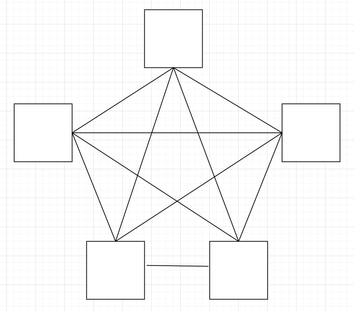 - 메시 토폴로지는 망형 토폴로지라고도 하며 그물망처럼 연결되어 있는 구조이다