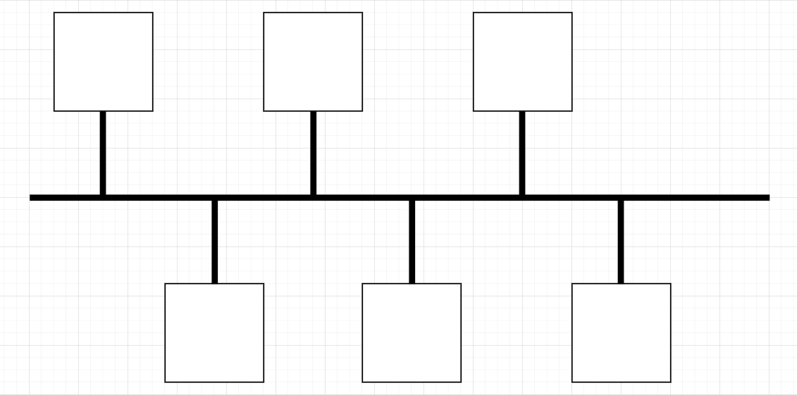 - 버스 토폴로지는 중앙 통신 회선 하나에 여러개의 노드가 연결되어
