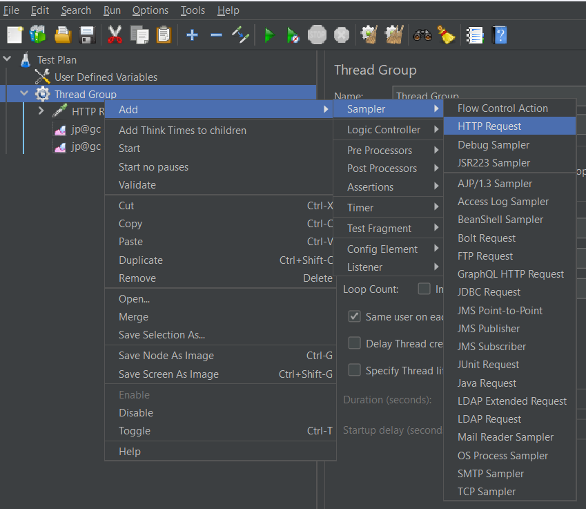 Thread Group -> Add -> Sampler -> HTTP Request