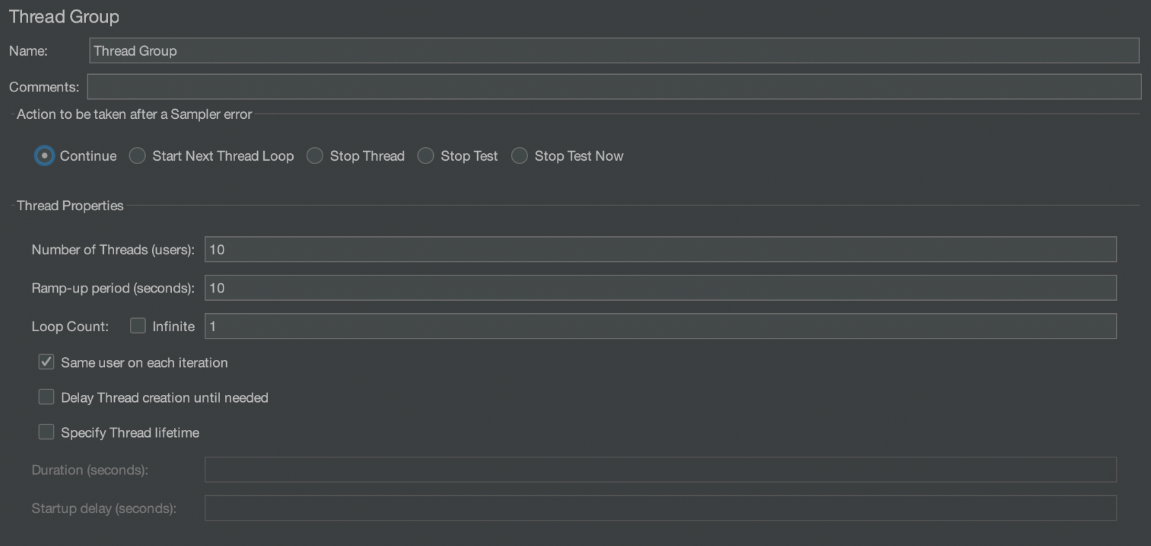 - Thread Group: 몇 개의 쓰레드가 동시에 요청을 보내는 지