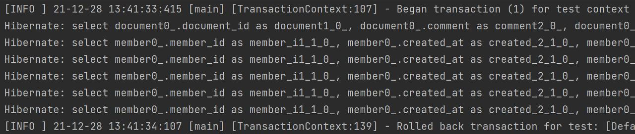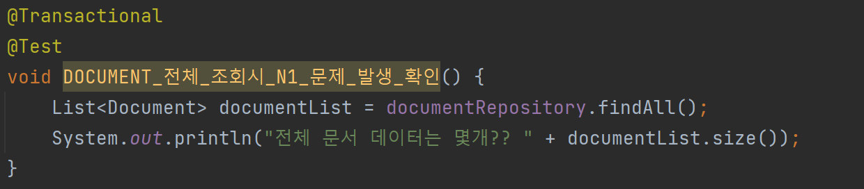 이때 document를 모두 불러와 본다그러면 첫번째로 전체 document를 불러오는 쿼리 1개랑document와 연관된 member를 각각 불러와지는 쿼리 5개가 발생한다