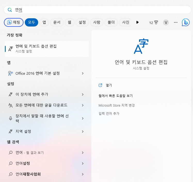 1) 윈도우 검색창 또는 탐색기에 "언어" 라고 치자